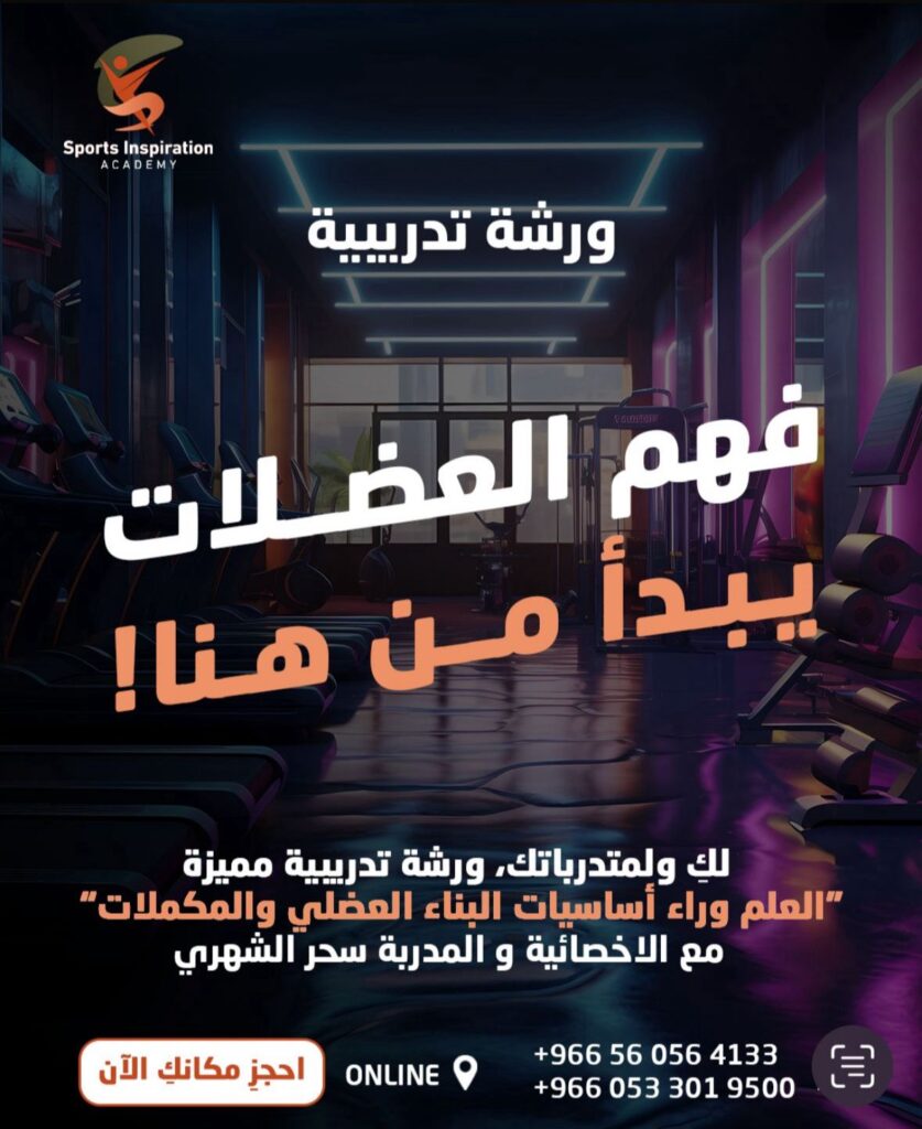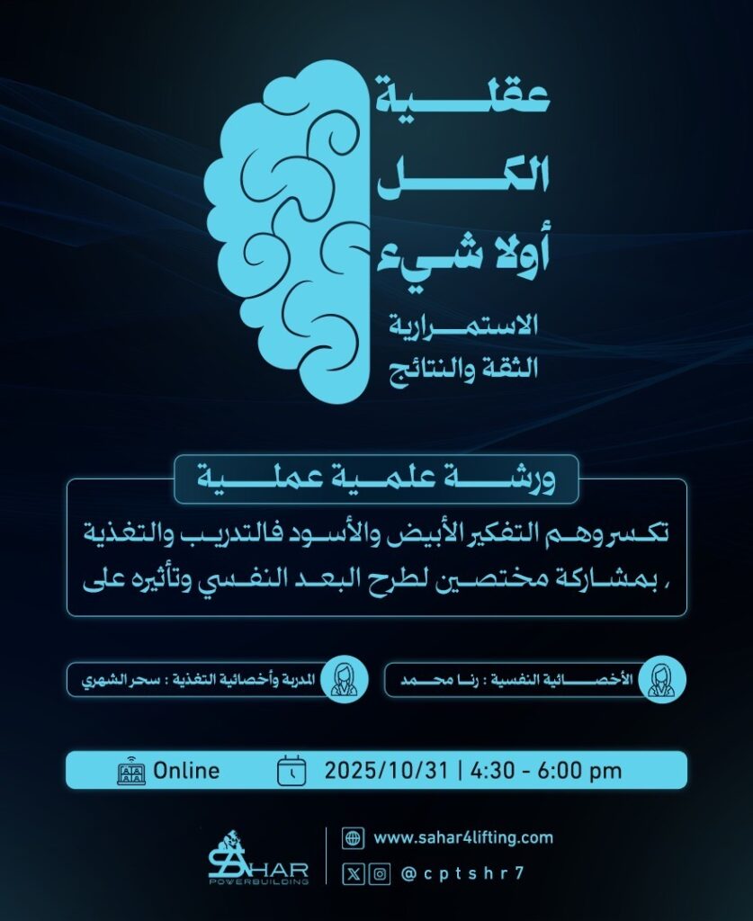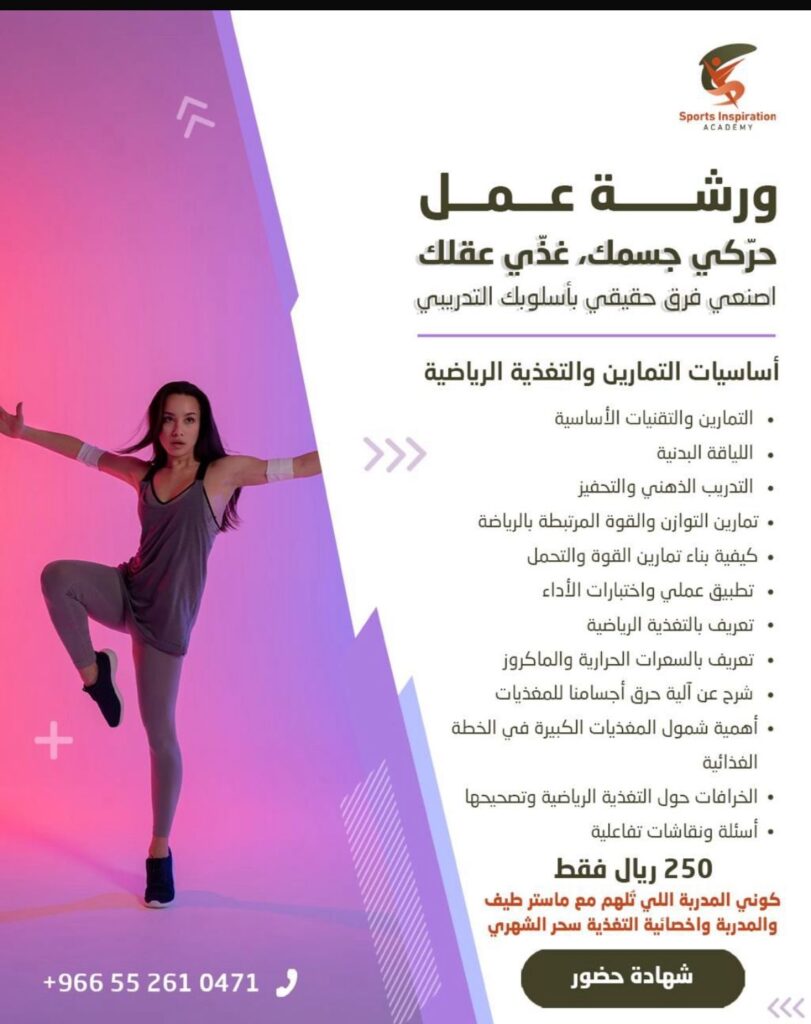 التدريب على أسس علمية تضمن لك الوصول لهدفك باقات التدريب الشخصي الإستمتاع برحلة السعي نحو تحقيق أهداف الصحة الجسديه والنفسية بكل واقعيه و وضع فارق ملموس في حياة الأفراد على جميع الأصعدة ، إتخذ الخطوة معنا نحو التغيير واترك الباقي علينا باقات التدريب الشخصي باقة 3 أشهر متابعة مستمرة جداول شهرية نظام غذائي أُنقر هنا باقة 6أشهر متابعة مستمرة جداول شهرية نظام غذائي أُنقر هنا باقة سنة متابعة مستمرة جداول شهرية نظام غذائي أُنقر هنا باقة التجديد متابعة مستمرة جداول شهرية نظام غذائي أُنقر هنا ورشات تدريبية فهم نـــمــو العــضـلات يبدأ من هنا أُنقر هنا أساسيات التمارين والتغذية الرياضية أُنقر هنا عقلية الكل او الاشيء أُنقر هنا القسم النفسي استشارة نفسية اطلب استشارتك الاخصائية النفسيه : رنا محمد- اخصائية نفسية معتمدة من هيئة التخصصات الصحية - اخصائية نفسية بتطبيق لبية - اخصائية نفسية بمركز إرتقاء الافكار للإرشاد الأسري والنفسي والتربوي لإرسال بريد إلكتروني القسم التأهيلي والعلاجي اخصائية العلاج الطبيعي: الأخصائية/ هاجر الهملاني- تأهيل الإصابات الرياضية - ممارس معتمد للإبر الجافة - ممارس معتمد للعلاج اليدوي للعمود الفقري والمفاصل - تأهيل الحالات العصبية والعضلية - تأهيل ما بعد العمليات الجراحية والكسور لإرسال بريد إلكتروني استشارة اخصائي العلاج الطبيعي اطلب استشارتك استشاره مع خطة علاجيه اطلب استشارتك القسم الرياضي استشارة رياضية اطلب استشارتك