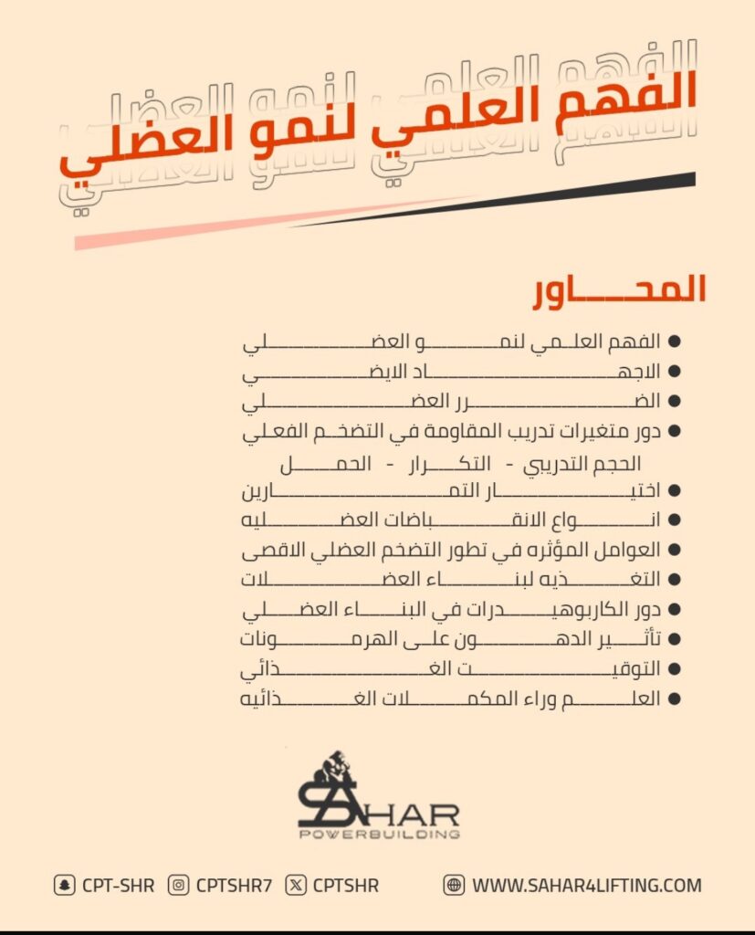 التدريب على أسس علمية تضمن لك الوصول لهدفك باقات التدريب الشخصي الإستمتاع برحلة السعي نحو تحقيق أهداف الصحة الجسديه والنفسية بكل واقعيه و وضع فارق ملموس في حياة الأفراد على جميع الأصعدة ، إتخذ الخطوة معنا نحو التغيير واترك الباقي علينا باقات التدريب الشخصي باقة 3 أشهر متابعة مستمرة جداول شهرية نظام غذائي أُنقر هنا باقة 6أشهر متابعة مستمرة جداول شهرية نظام غذائي أُنقر هنا باقة سنة متابعة مستمرة جداول شهرية نظام غذائي أُنقر هنا باقة التجديد متابعة مستمرة جداول شهرية نظام غذائي أُنقر هنا ورشات تدريبية الفهم العلمي لنـــمــو العــضـلي أُنقر هنا أساسيات التغذية الرياضية أُنقر هنا عقلية الكل او الاشيء أُنقر هنا القسم النفسي استشارة نفسية اطلب استشارتك الاخصائية النفسيه : رنا محمد- اخصائية نفسية معتمدة من هيئة التخصصات الصحية - اخصائية نفسية بتطبيق لبية - اخصائية نفسية بمركز إرتقاء الافكار للإرشاد الأسري والنفسي والتربوي لإرسال بريد إلكتروني القسم التأهيلي والعلاجي اخصائية العلاج الطبيعي: الأخصائية/ هاجر الهملاني- تأهيل الإصابات الرياضية - ممارس معتمد للإبر الجافة - ممارس معتمد للعلاج اليدوي للعمود الفقري والمفاصل - تأهيل الحالات العصبية والعضلية - تأهيل ما بعد العمليات الجراحية والكسور لإرسال بريد إلكتروني استشارة اخصائي العلاج الطبيعي اطلب استشارتك استشاره مع خطة علاجيه اطلب استشارتك القسم الرياضي استشارة رياضية اطلب استشارتك